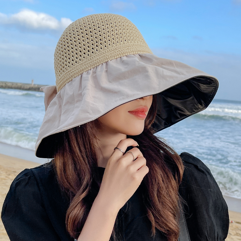 遮阳帽子女夏防紫外线遮脸防晒帽空顶大檐可折叠扎马尾沙滩太阳帽