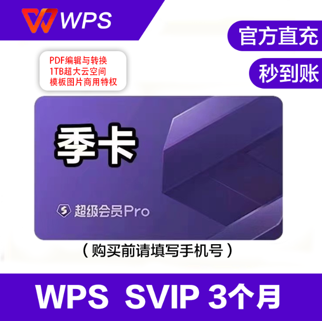 【自动直冲】WPS超级会员『3个月』直冲丨立即到账