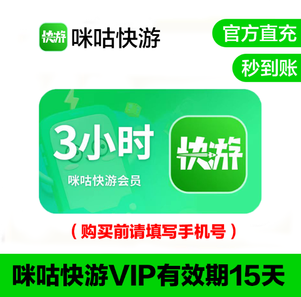 【直冲】咪咕快游会员15天有效期时长3小时/时长内无限畅玩游戏